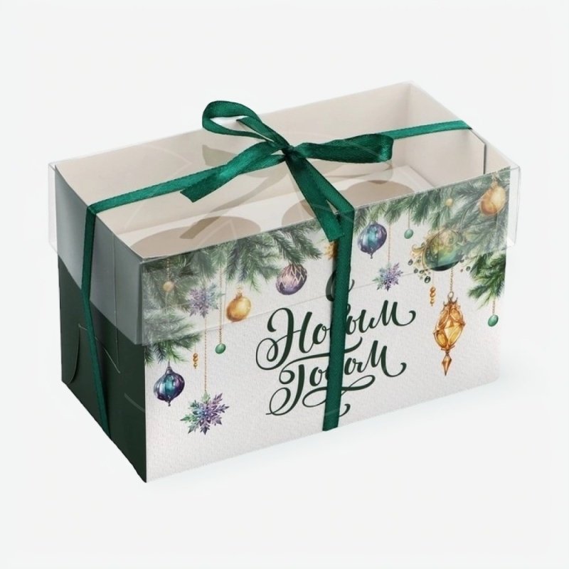 Доставка Коробка на 2 капкейка с прозрачной крышкой "С Новым годом" 16х8х10 см из магазина в вашем городе: