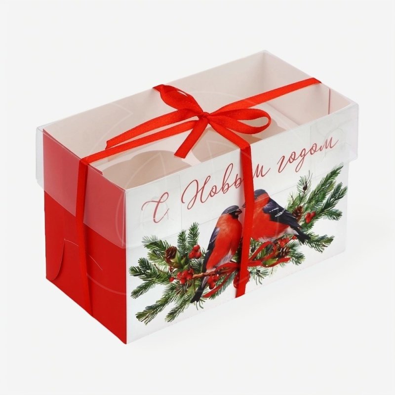 Доставка Коробка на 2 капкейка с прозрачной крышкой "Снегири" 16х8х10 см из магазина в вашем городе: