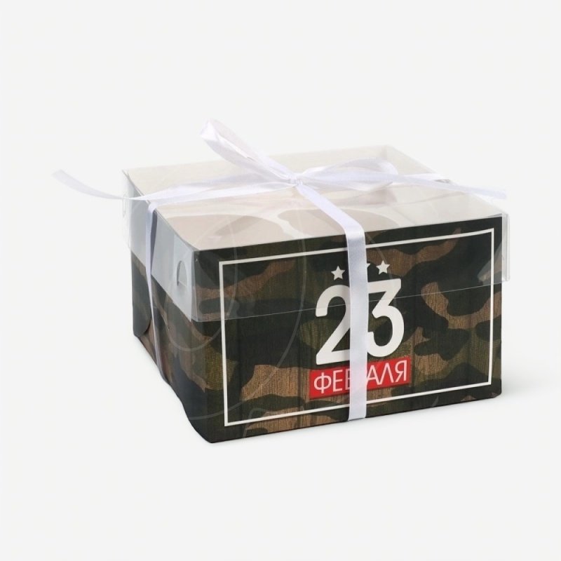 Доставка Коробка на 4 капкейка с окном "23 Февраля" 16х16х10 см из магазина в вашем городе: