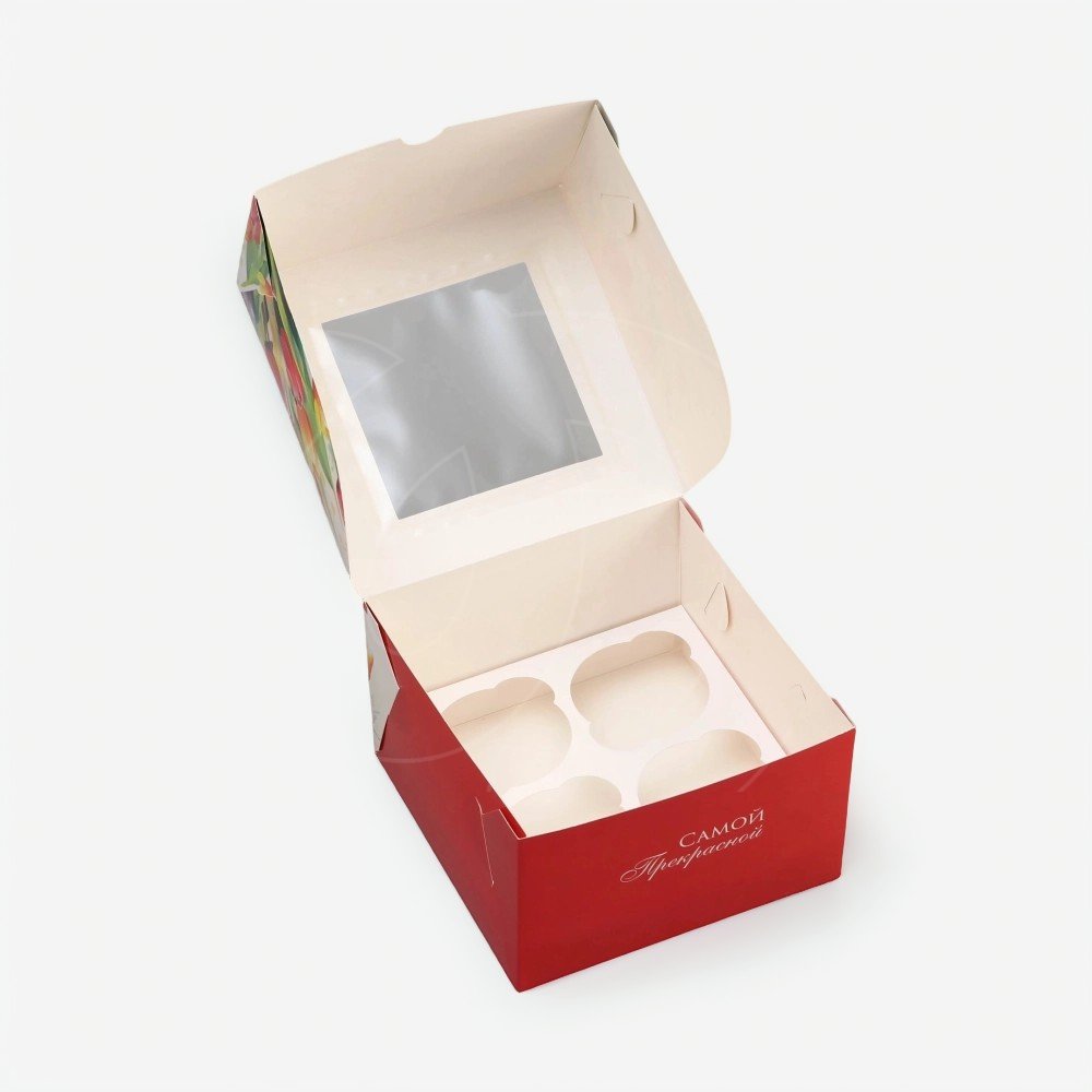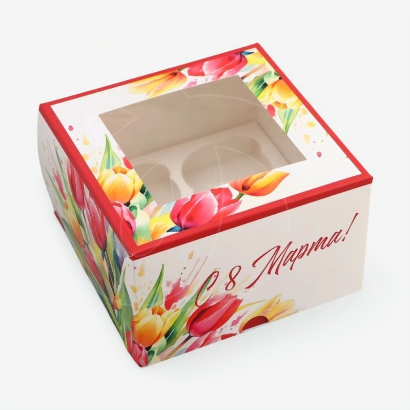 Доставка Коробка на 4 капкейка с окном "С 8 Марта!" 16х16х10 см из магазина в вашем городе:
