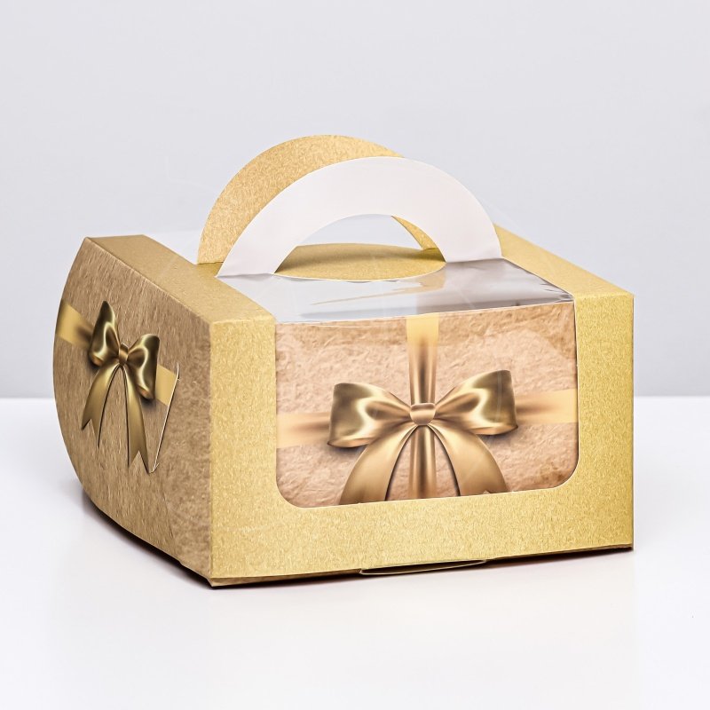 Доставка Коробка для бенто-торта с окном "Золотой бант" 14х14х8 см из магазина в вашем городе: