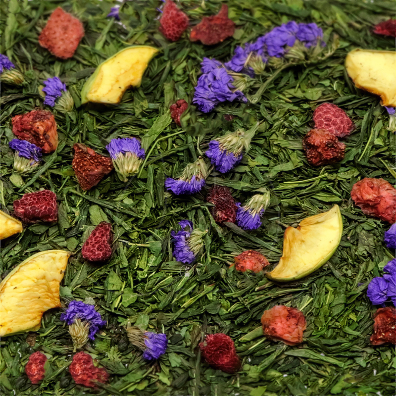 | Состав | кусочки клубники, ягоды малины, дольки яблока, листья черной смородины и цветы незабудки. |