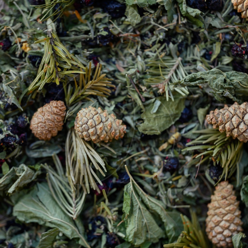 Составжимолость, курильский чай, лист чёрной смородины, пихтовая лапка, сосновая шишка, черника
