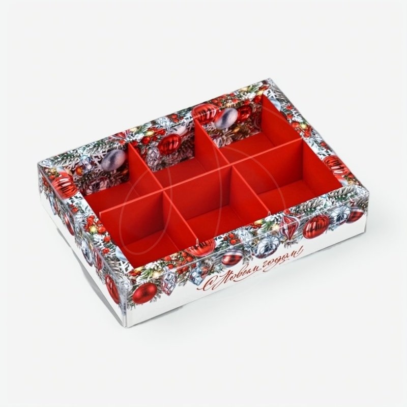 Доставка Коробка на 6 конфет с пластиковой крышкой "Ёлочные новогодние шары" 10х14,5х3 см из магазина в вашем городе:
